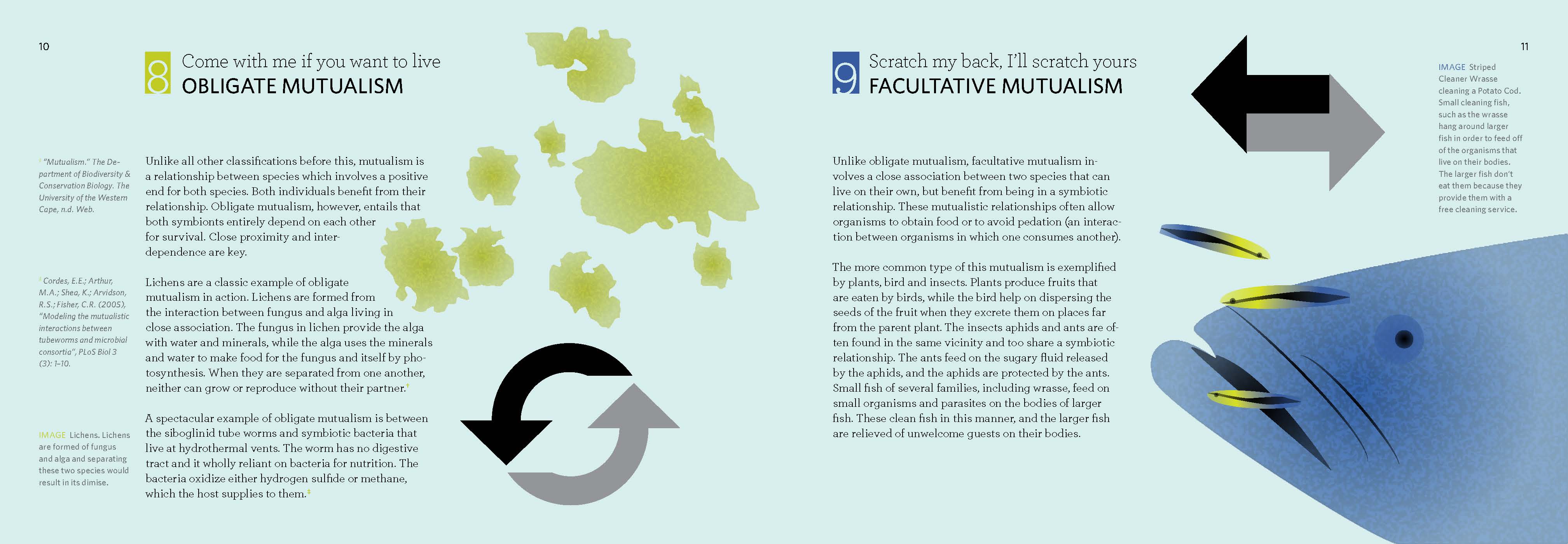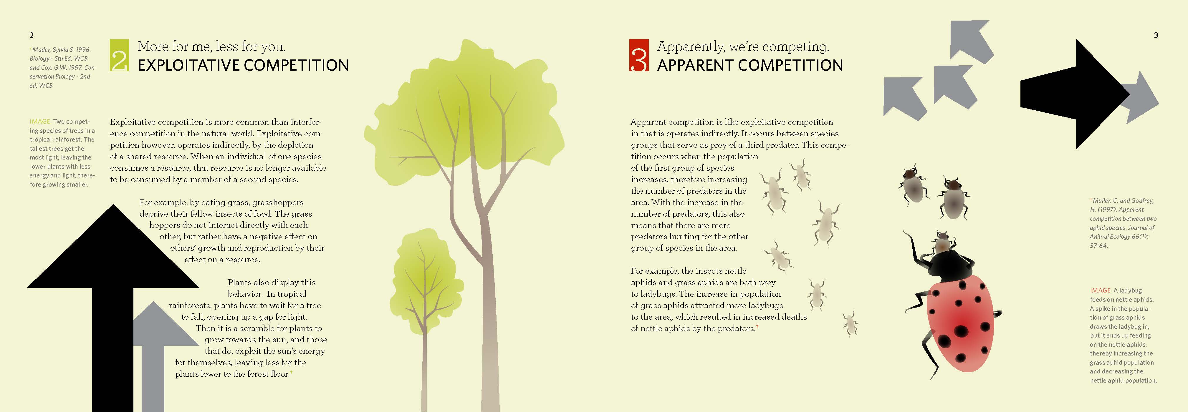 This was a book designed to inform and educate a reader about species interaction in nature. Using simple, but fun illustrations that appeal to both an older and younger demographic, and arrow infographics to describe the types of interactions species have, I created this book to give detailed information without being “textbook.”